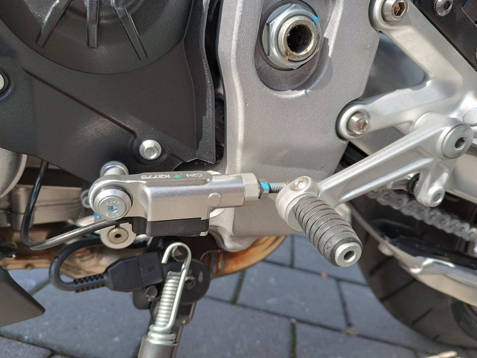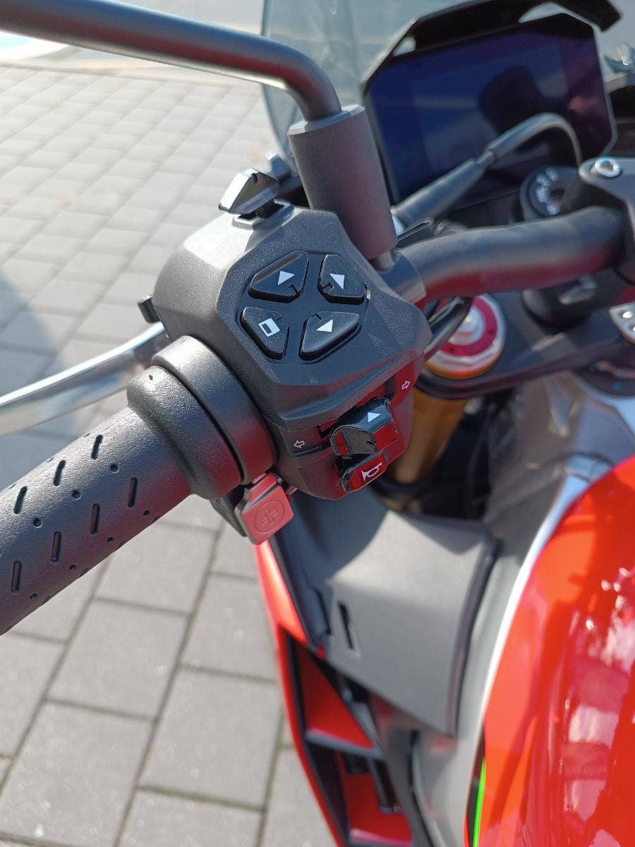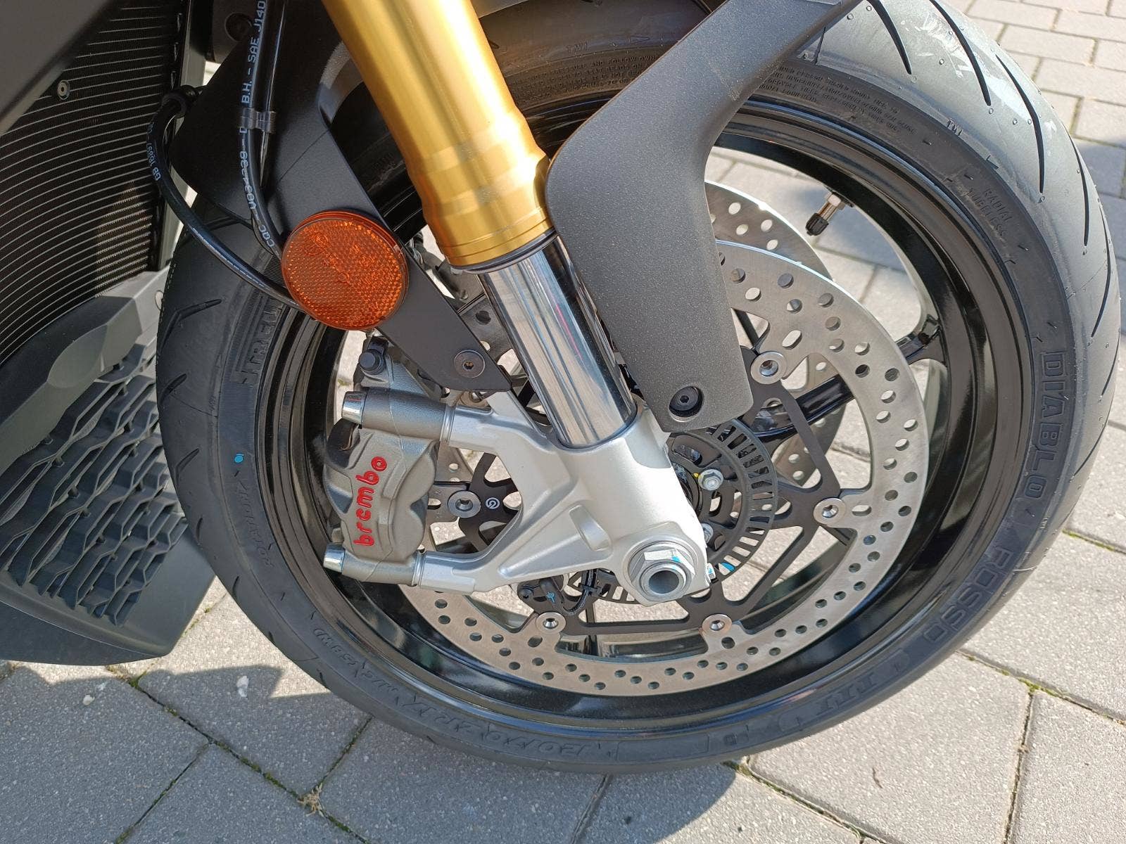 Přední brzda: Dva kotouče Ø320 mm, plovoucí, čtyřpístkové radiální brzdové třmeny Brembo. Radiální přední hlavní brzdový válec. Náklonové ABS