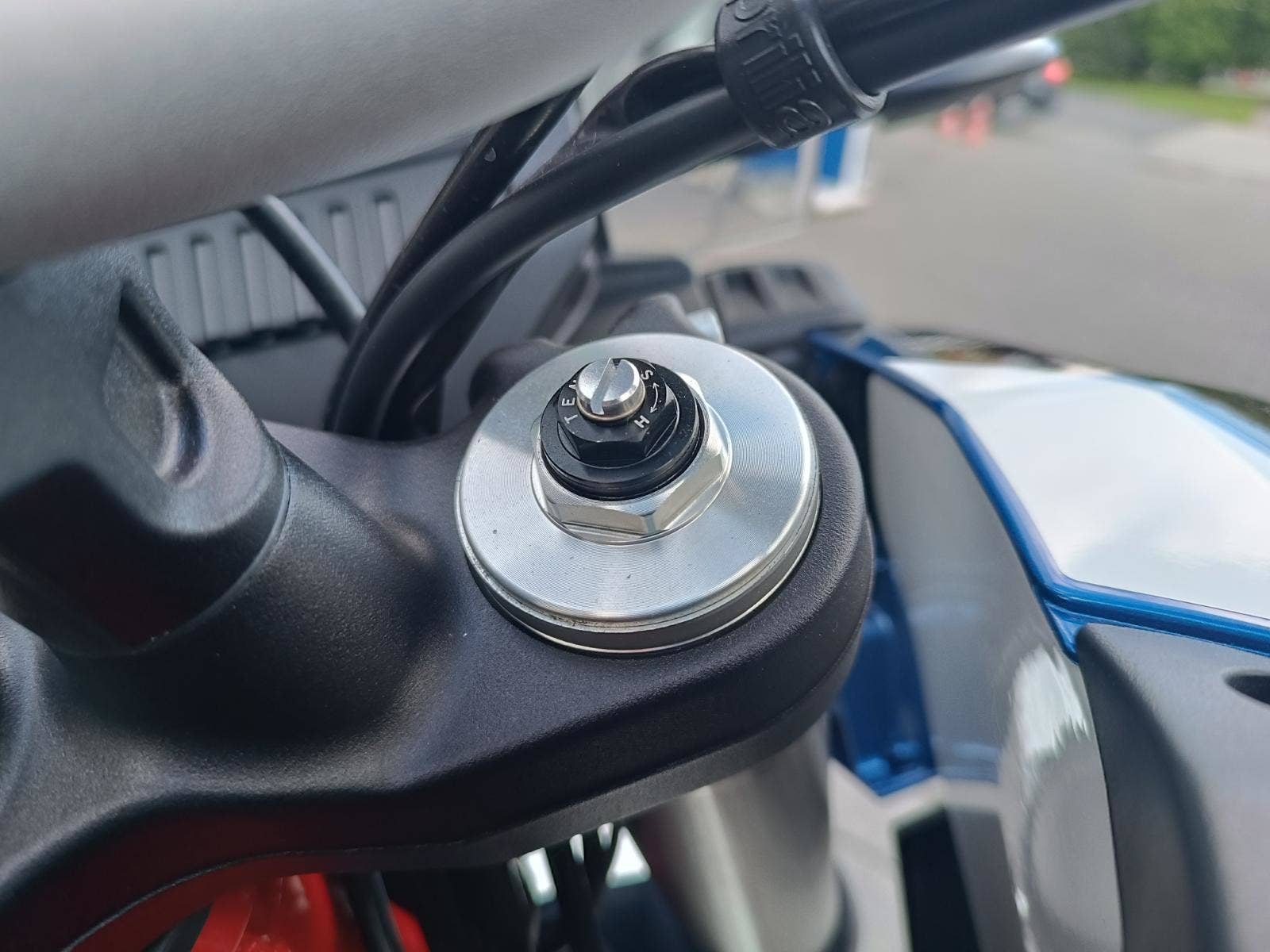 Přední brzda - Dvojitá kotoučová 300 mm, třmeny Brembo se 4 protilehlými pístky? 30/32 mm. Axiální pumpa a oplétané brzdové hadice.