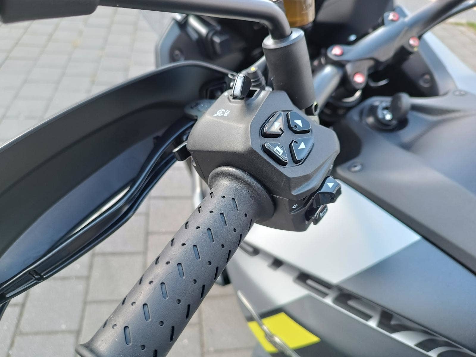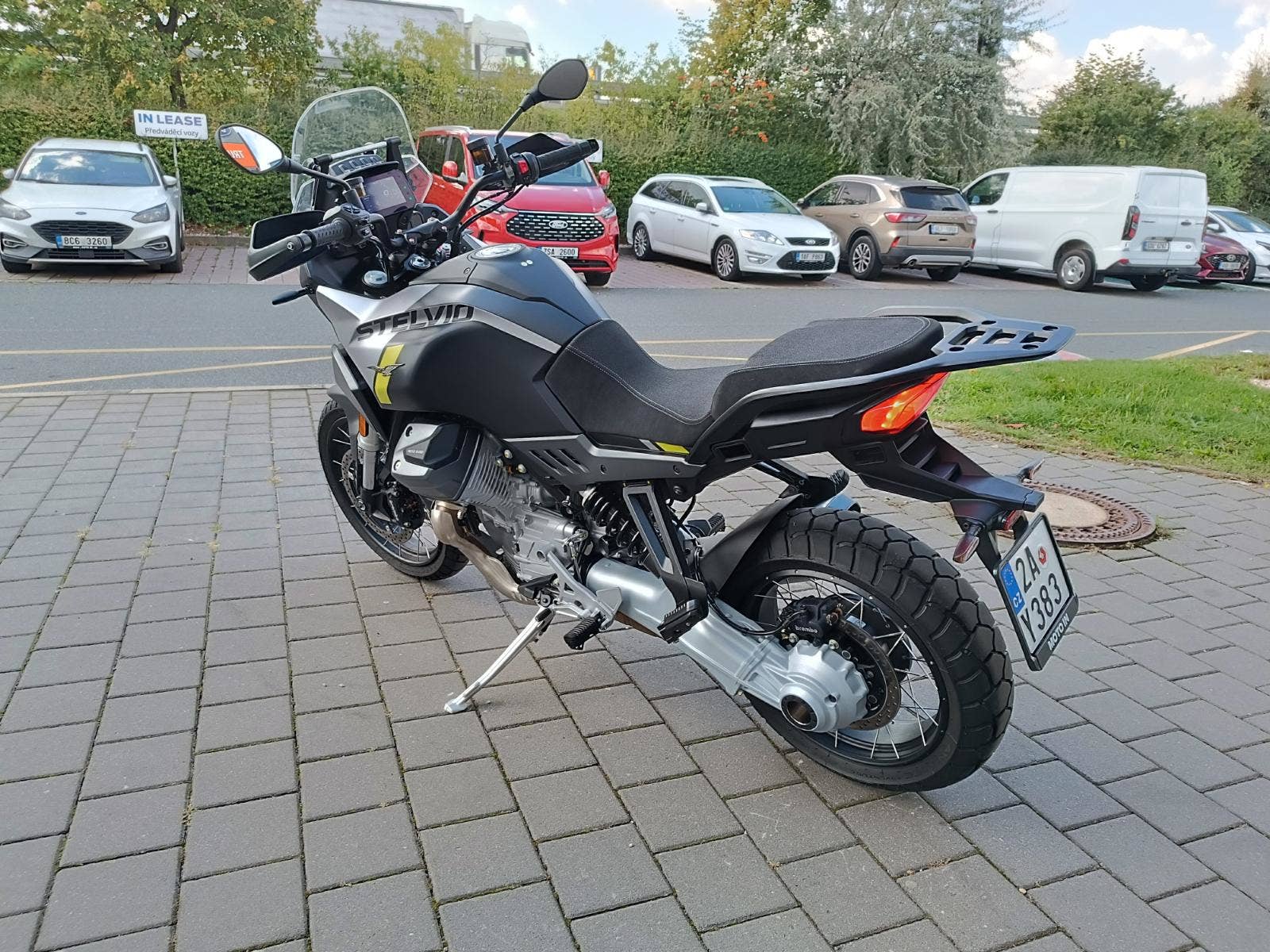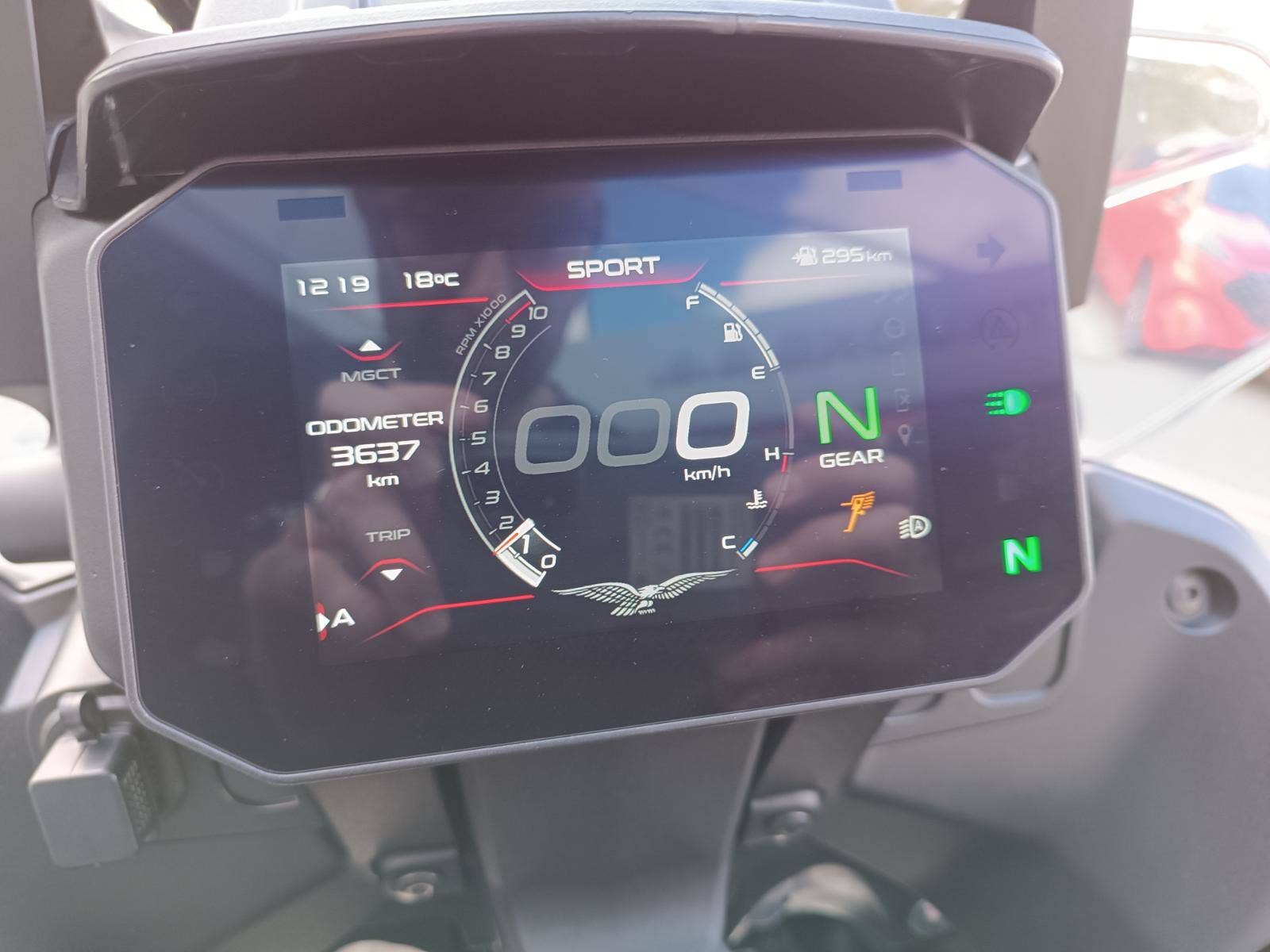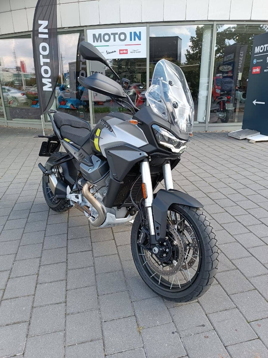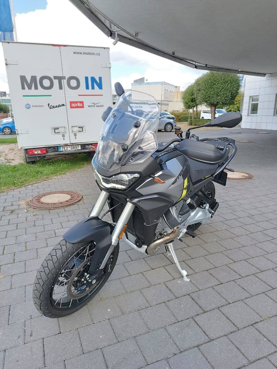 Výbava - Full LED světlomety s DRL, přisvětlení do zákrut, LED směrovky, náklonové ABS a Moto Guzzi Traction Control, tempomat, 5 jízdních režimů, plnobarevný TFT displej, elektricky nastavitelný čelní štít, chrániče rukou, Předpříprava pro Moto Guzzi MIA, Quickshifter, TPMS (Systém monitorování tlaku v pneumatikách)