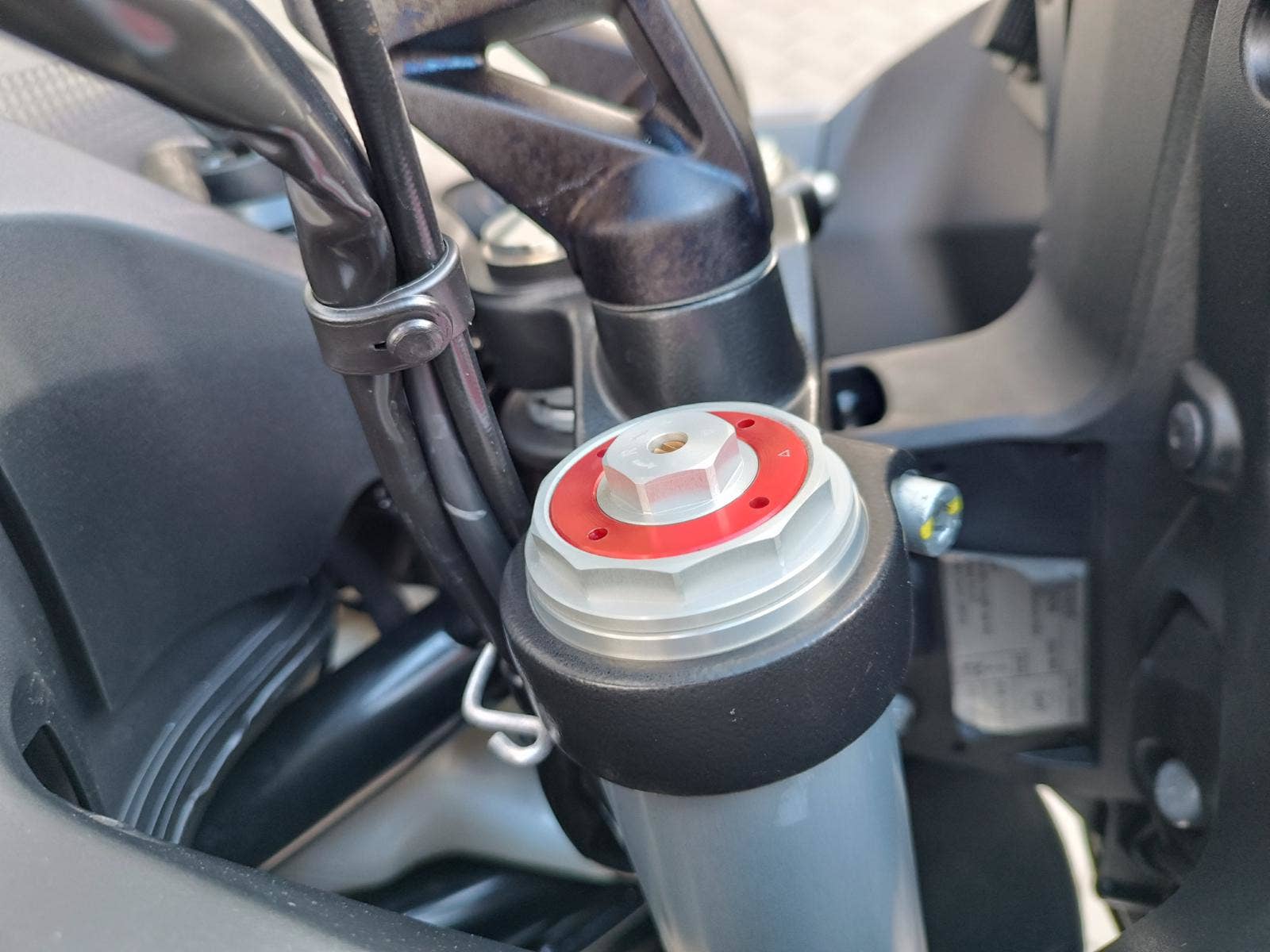 Přední brzda dva plovoucí kotouče? 320 mm, 4pístkové radiální monoblokové třmeny Brembo. Radiální přední hlavní brzdový válec. Náklonové ABS.