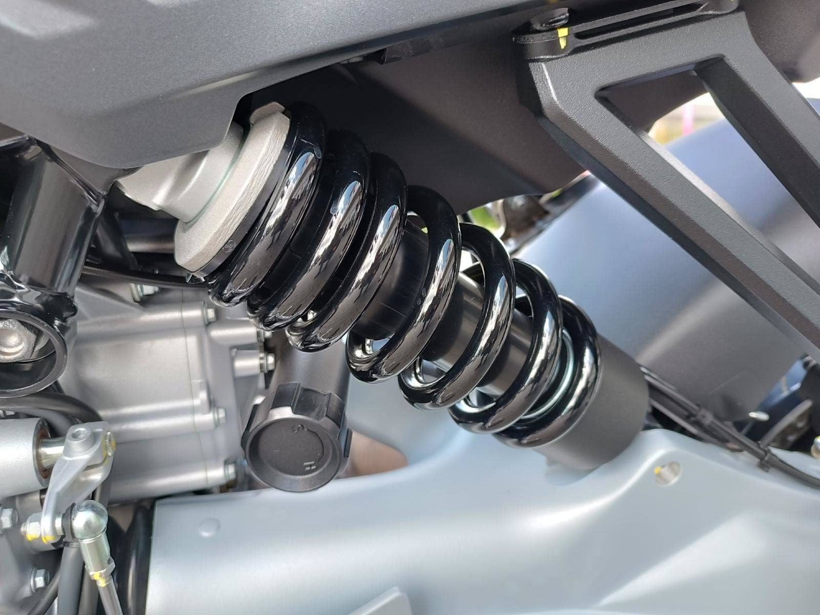 Zadní odpružení tlumič Monoshock s nastavitelným předpětím a odskokem. Možnost dálkového nastavení předpětí pružiny. Zdvih 170 mm